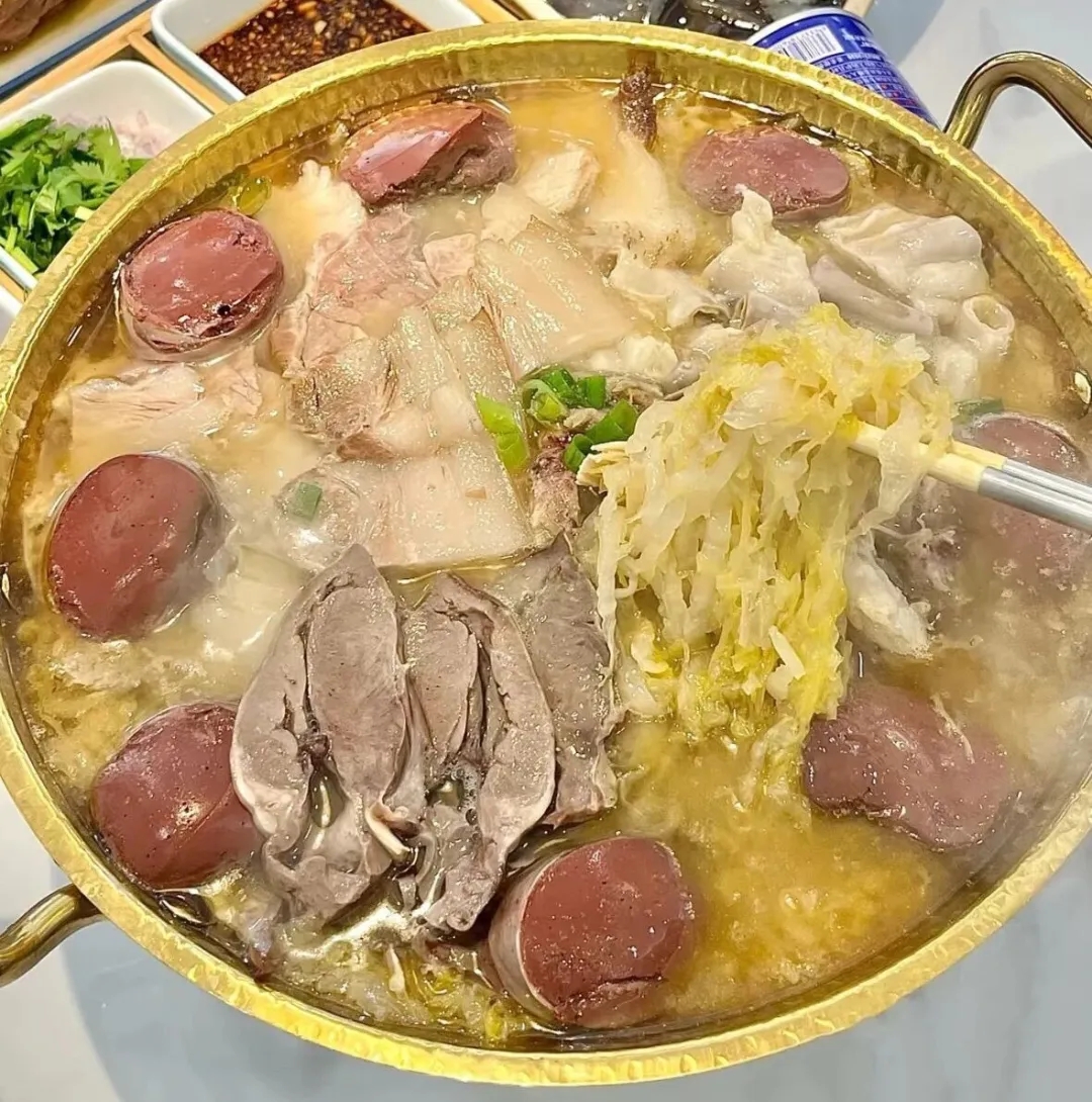 酸菜五花肉!东北冬日经典,酸香开胃的酸菜搭配肥而不腻的白肉和血肠,酸香解腻却又油脂饱满。老味道山楂酒的甜润可以柔和酸菜的锐利,平衡白肉的脂感,酸甜交织,不仅暖身,重点是相当开胃!吃起来格外舒畅。